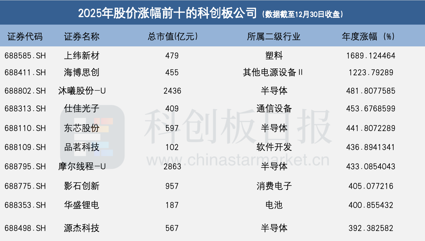 2025年初至2025年12月30日收盘,上纬新材成为科创板涨幅最大的公司,涨幅高达1689.1245%。此外,海博思创、沐曦股份、仕佳光子、东芯股份、品茗科技、摩尔线程、影石创新、华盛锂电、源杰科技亦名列2025年科创板公司前十大涨幅榜单。