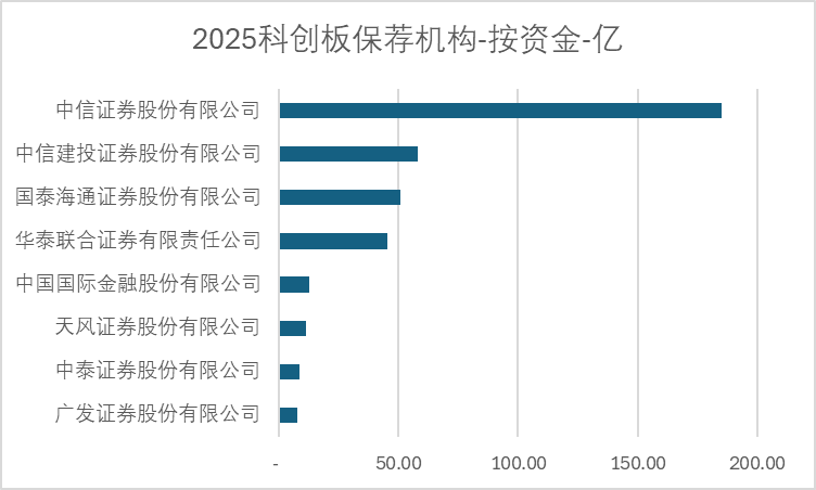 2025年科创板IPO公司的保荐机构方面,据科创板研究中心统计,按照募集金额降序排列分别为:中信证券股份有限公司、中信建投证券股份有限公司、国泰海通证券股份有限公司、华泰联合证券有限责任公司、中国国际金融股份有限公司、天风证券股份有限公司、中泰证券股份有限公司、广发证券股份有限公司。