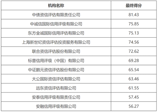 银行保险资产管理业协会的信评机构评价结果的最终得分显示:中债资信排名第一,中诚信国际、东方金诚、新世纪、联合资信等老牌机构排名前列;而安泰评级、安融评级排名靠后。