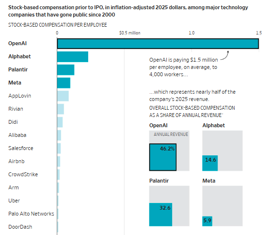 业内基于薪酬调查机构Equilar数据的分析显示,这一150万美元的平均薪酬,约为其他18家大型科技公司上市前员工平均薪酬的34倍。该分析涵盖了过去25年间的主要科技公司IPO案例。为了反映通胀因素的影响,这些薪酬数字均已调整为2025年的美元价值。