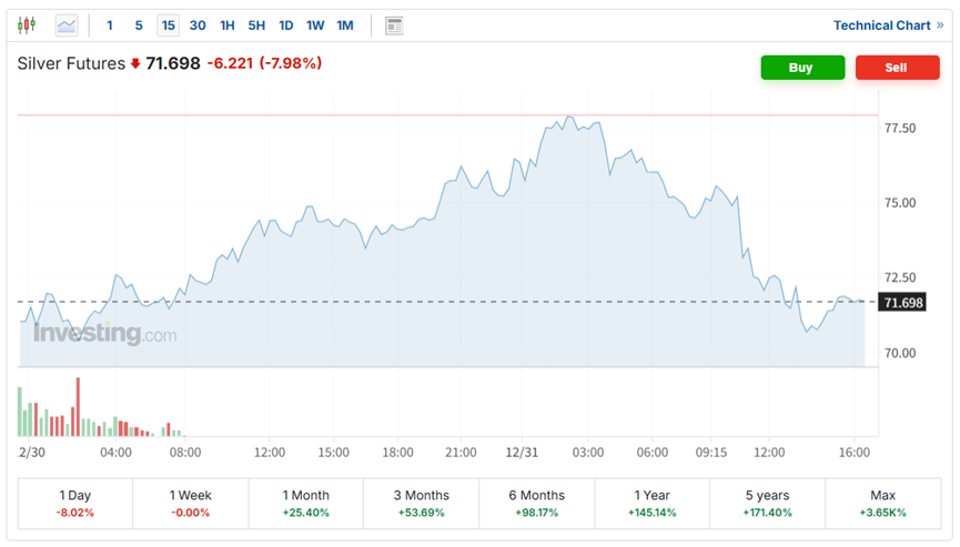 本周,贵金属价格以动荡的走势为历史性的一年画上了句号。白银的波动尤为剧烈,周一早盘白银期货价格一度飙升至82美元/盎司上方的纪录高位,随后高台跳水。