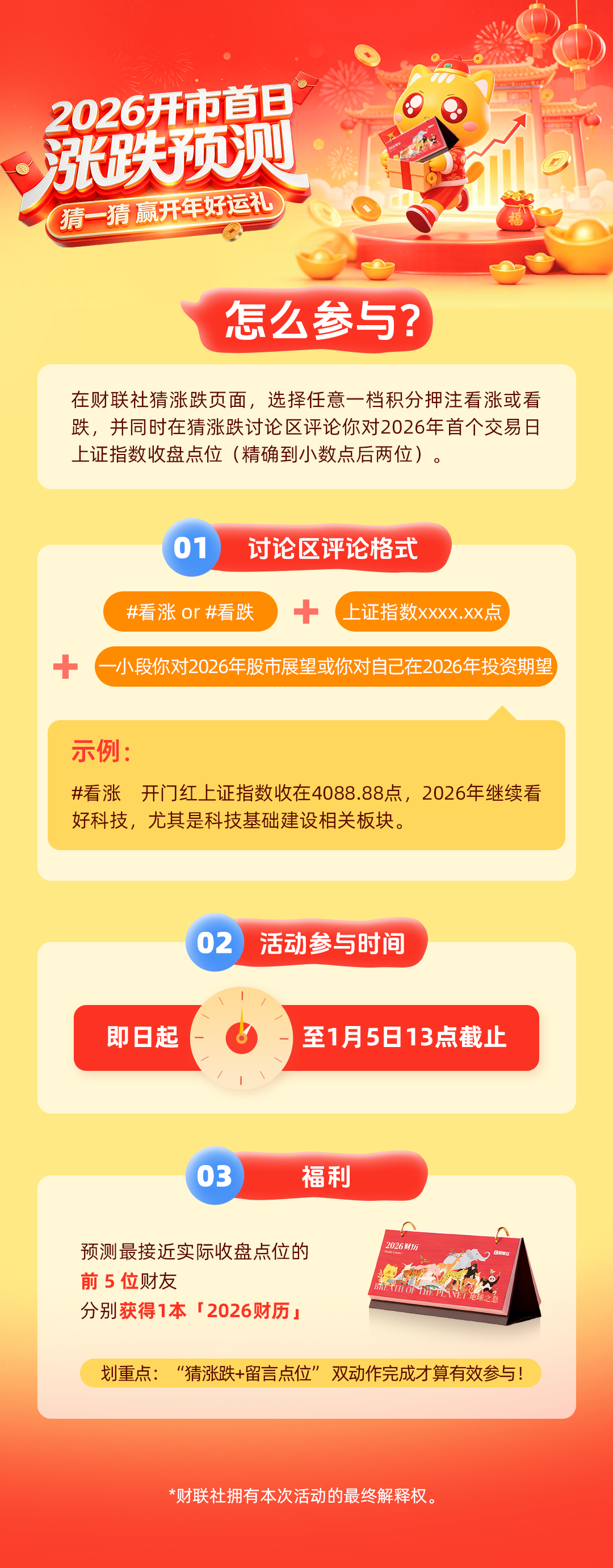 前往【财联社猜涨跌功能区】(点此可跳转前往→)积分押注看涨或看跌,并在猜涨跌讨论区评论看涨or看跌+上证指数点位(精确到小数点后2位)+一小段你对2026年的投资展望。