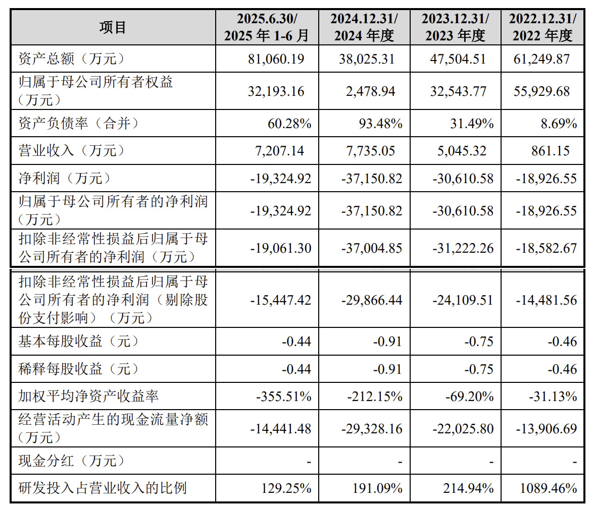 2022年-2025年上半年,同心医疗分别实现营收861.15万元、5045.32万元、7735.05万元、7207.14万元,归母净利润分别为-1.89亿元、-3.06亿元、-3.72亿元和-1.93亿元,同期的研发费用分别为9381.86万元、1.08亿元、1.48亿元、9315.39万元。