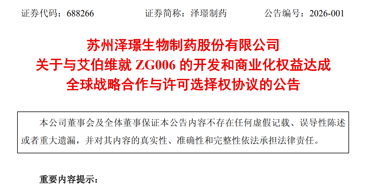 《科创板日报》1月1日讯(记者 史士云)在2025年阳历年最后一天,泽璟制药(688266.SH)开了一笔BD压轴单。