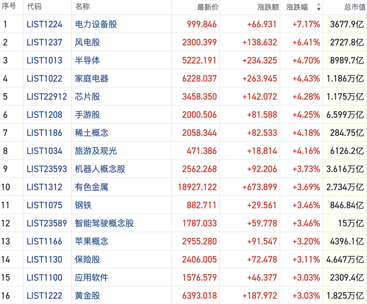 其他方向上,AI主线全线爆发,半导体芯片股全天强势,软件、算力等相关概念也表现活跃。光伏、旅游、游戏、影视等行业纷纷走强,商业航天概念热度陡增。