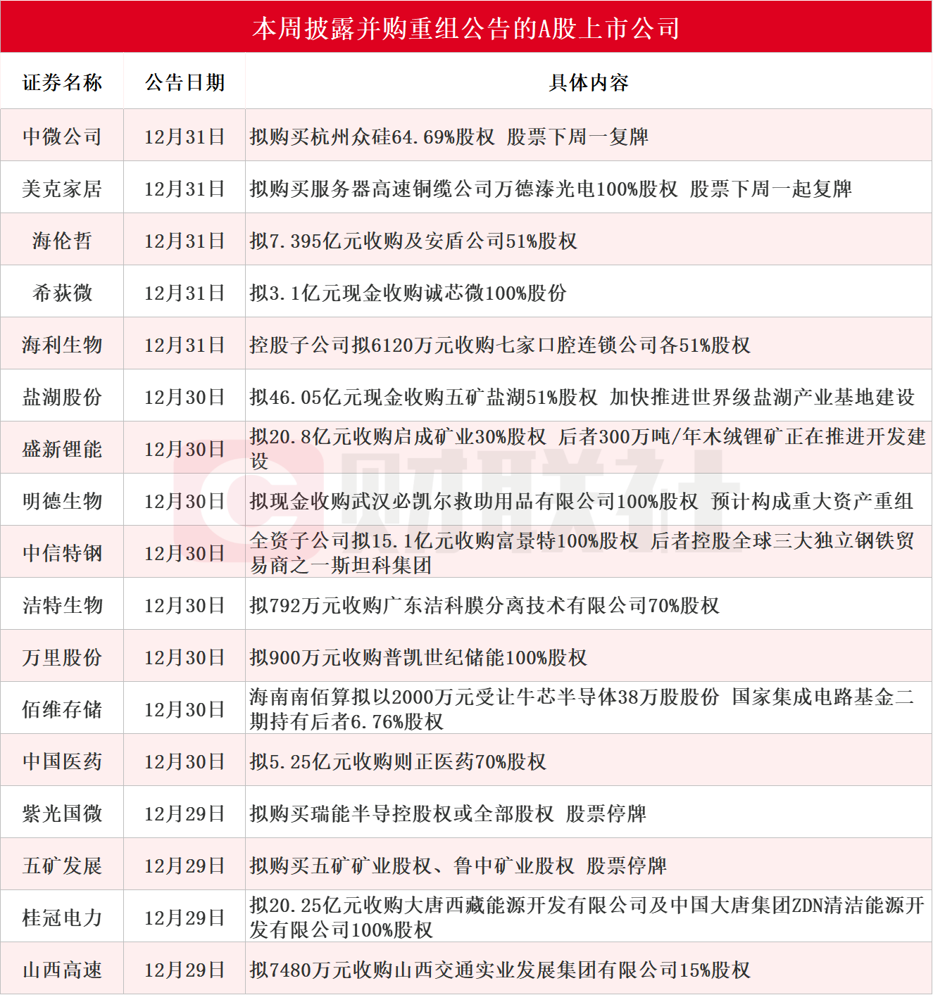 据财联社不完全统计,截至发稿,本周披露并购重组进展的A股上市公司共有17家,包括中微公司、美克家居、海伦哲、希荻微、海利生物、盐湖股份、盛新锂能、明德生物、中信特钢、洁特生物、万里股份、佰维存储、中国医药、紫光国微、五矿发展、桂冠电力和山西高速。具体情况如下图:
