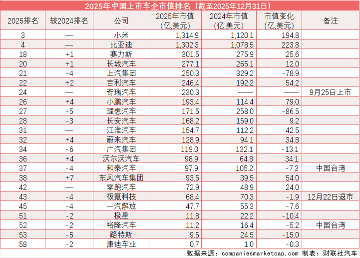 财联社1月5日讯(记者 张屹鹏)汽车产业深度变革背景下,全球车企市值排名的更新既是中国、外资车企行业地位与竞争格局的直观体现,亦为市场对汽车企业全产业链价值的综合判断。