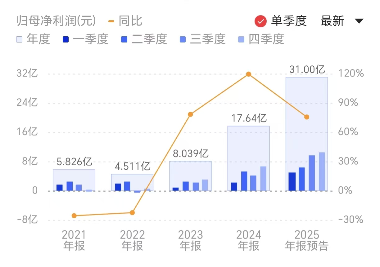财联社1月5日电,赤峰黄金(600988.SH)发布2025年度业绩预告,预计归属于上市公司股东的净利润为30亿元-32亿元,与上年同期相比增加约70%-81%;预计归属于上市公司股东的扣除非经常性损益的净利润为29.7亿到31.7亿元,与上年同期相比增加约75%到86%。公司2025年度主营黄金产量约为14.4吨,主营黄金产品销售价格同比上升约49%,境内外矿山企业盈利能力增强。小财注:Q3净利9.51亿元,据此计算,Q4净利预计9.42亿元-11.42亿元,环比变动-0.9%至20.1%。