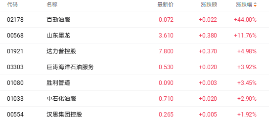 截至收盘,百勤油服(02178.HK)涨44%、山东墨龙(00568.HK)涨11.76%、达力普控股(01033.HK)涨4.98%。