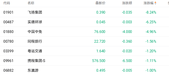 旅游板块同步走弱。截至收盘,飞扬集团(01901.HK)跌8.24%、中国中免(01880.HK)跌4.96%、同程旅行(00780.HK)跌1.56%。