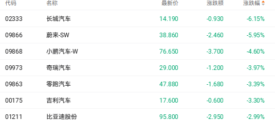 汽车股延续回调态势。截至收盘,长城汽车(02333.HK)跌6.15%、蔚来-SW(09866.HK)跌5.95%、小鹏汽车-W(09868.HK)跌4.60%。
