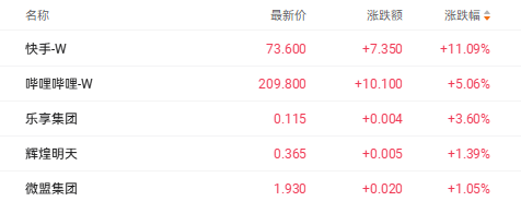 短视频相关个股的表现突出。截至收盘,快手-W(01024.HK)涨11.09%、哔哩哔哩吧-W(09626.HK)涨5.06%、微盟集团(02013.HK)涨1.05%。