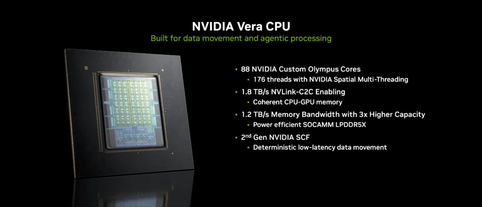 从硬件配置来看,Vera Rubin超级芯片由RubinGPU与VeraCPU构成。RubinGPU被大量电源电路环绕,配备8个HBM4显存位点,且集成两颗Reticle尺寸GPU芯片;VeraCPU则搭载88个定制ARM核心,总计提供176个线程。