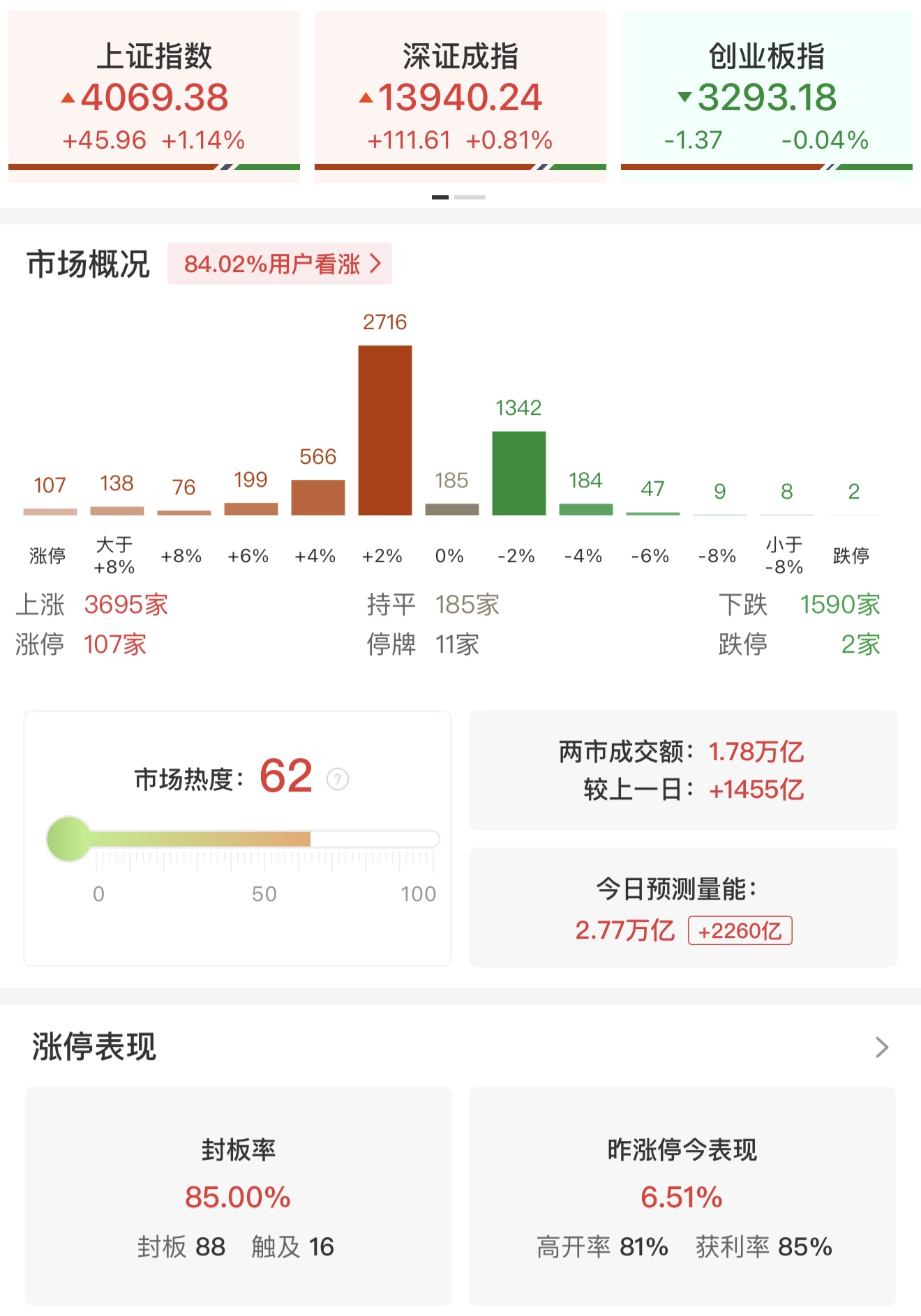 财联社1月6日电,沪指高开高走涨超1%,突破2025年11月14日的阶段高点,再创十年新高。沪深两市半日成交额1.78万亿,较上个交易日放量1455亿。热点板块多点开花,全市场近3700只个股上涨。从板块来看,脑机接口概念延续强势,十余只成分股涨停,三博脑科、美好医疗、创新医疗2连板。大金融板块走强,华林证券涨停,新华保险、中国太保均涨超6%。有色金属板块表现活跃,洛阳钼业、紫金矿业等多股创历史新高。商业航天概念反复活跃,鲁信创投8天6板。下跌方面,算力硬件概念下挫,汇绿生态大跌。截至收盘,沪指涨1.14%,深成指涨0.81%,创业板指跌0.04%。