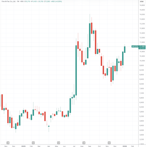 据悉,实现无折痕折叠屏的关键在于一种“激光钻孔金属显示板”,该结构能够在折叠屏幕时分散产生的应力,从而实现无可见折痕,同时还能增强屏幕耐用性。这种金属面板由韩国上市公司Fine M‑Tec供应,该公司股价在去年上涨86%的基础上,今年开年又上涨了14%。