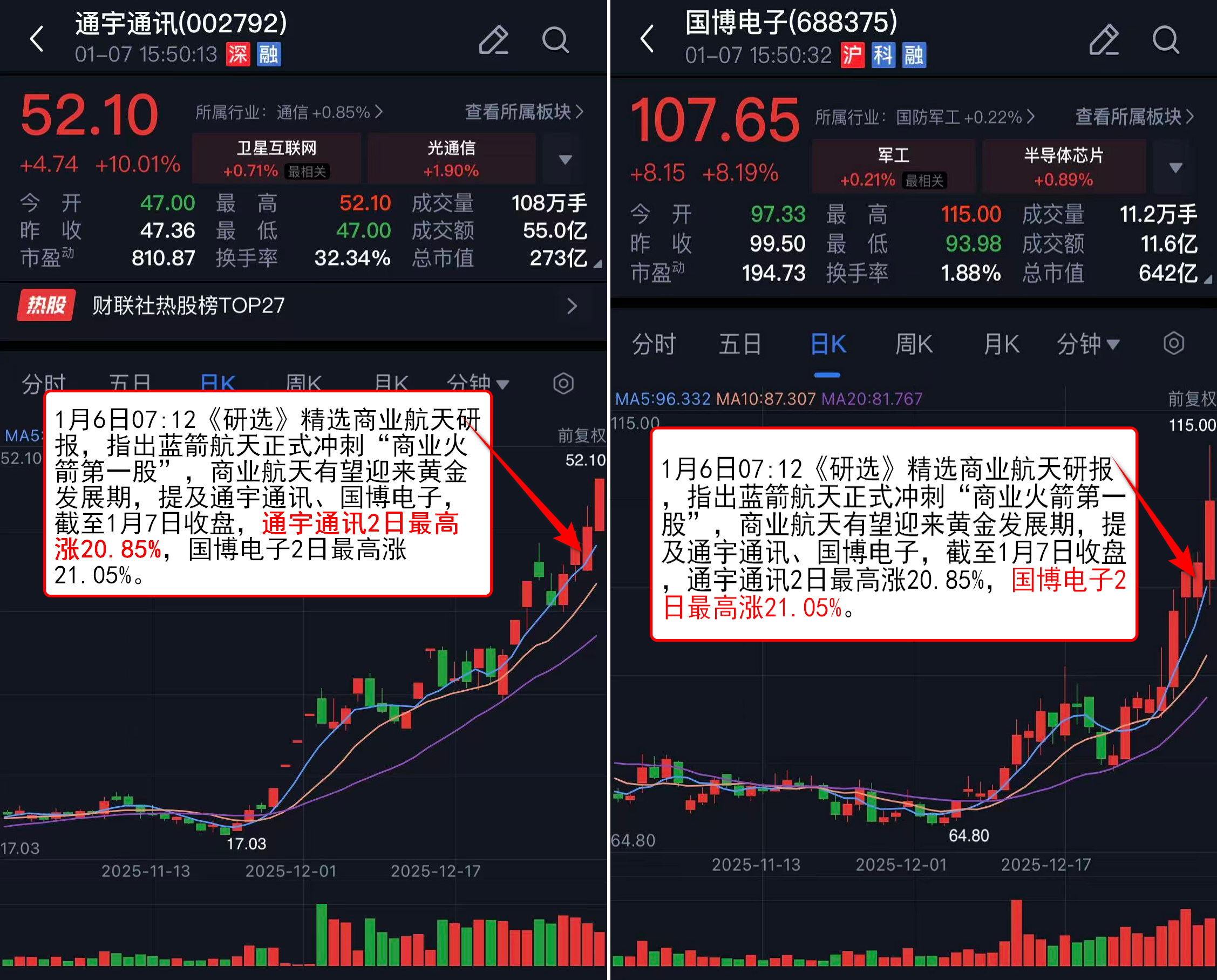 1月6日07:12《研选》精选商业航天研报,指出蓝箭航天正式冲刺“商业火箭第一股”,商业航天有望迎来黄金发展期,提及通宇通讯、国博电子,截至1月7日收盘,通宇通讯2日最高涨20.85%,国博电子2日最高涨21.05%。