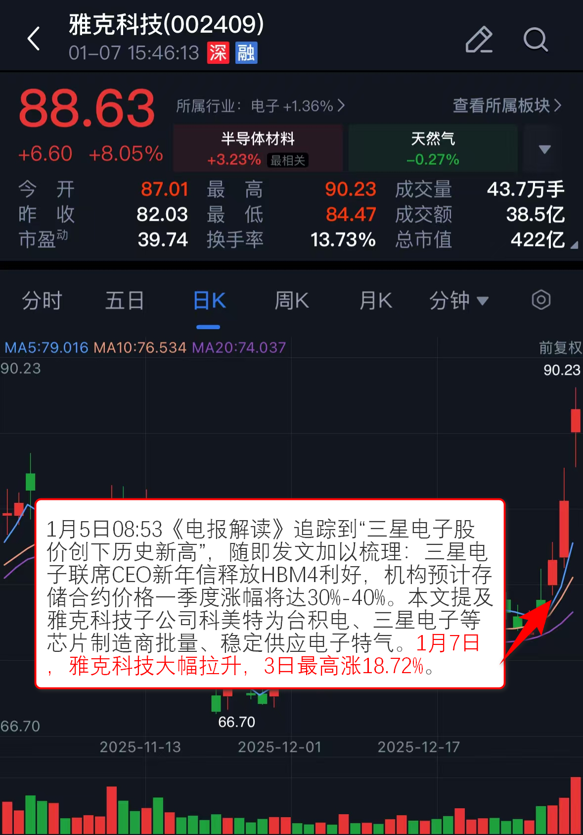 1月5日08:53《电报解读》追踪到“三星电子股价创下历史新高”,随即发文加以梳理:三星电子联席CEO新年信释放HBM4利好,机构预计存储合约价格一季度涨幅将达30%-40%。本文提及雅克科技子公司科美特为台积电、三星电子等芯片制造商批量、稳定供应电子特气。1月7日,雅克科技大幅拉升,3日最高涨18.72%。