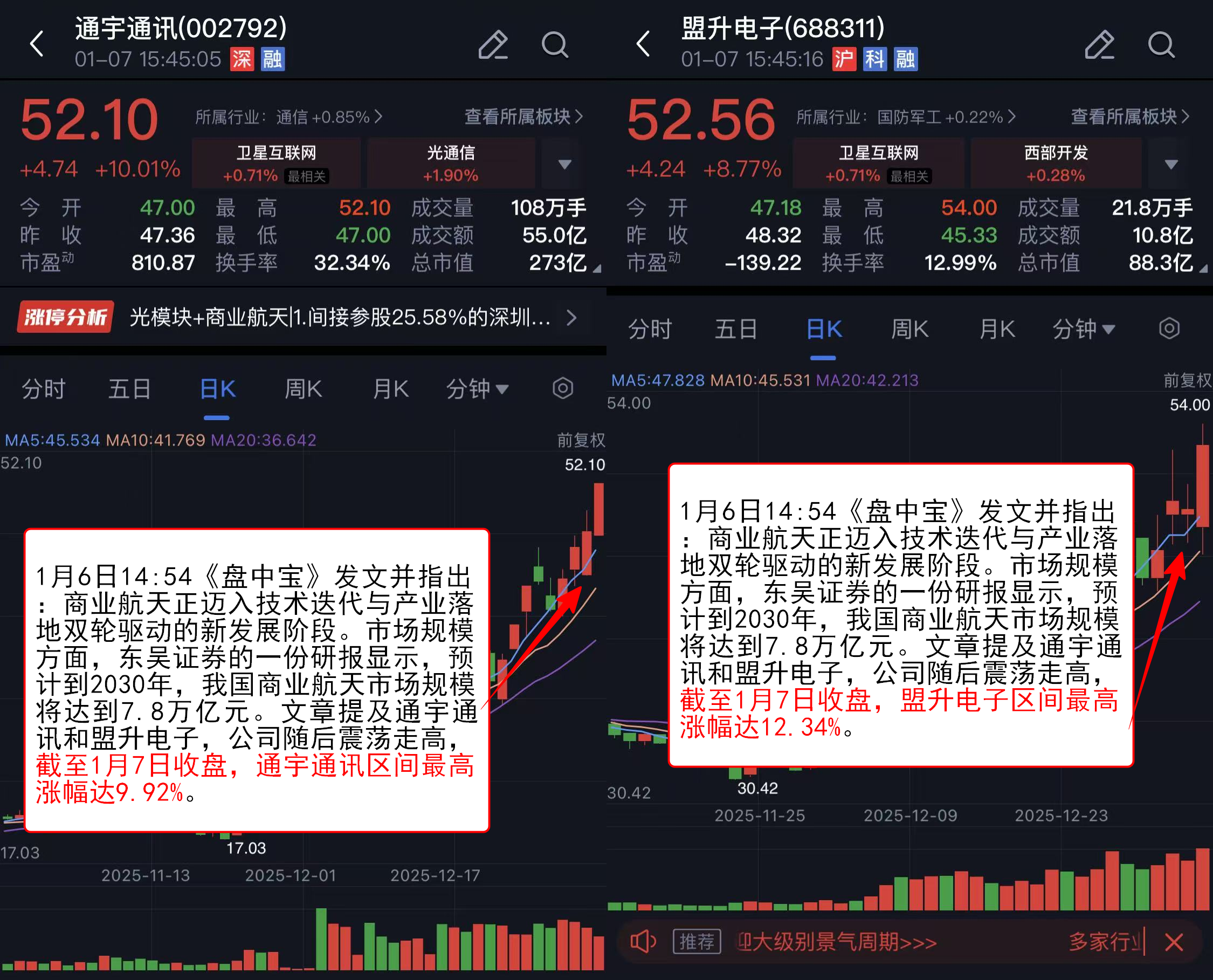 1月6日14:54《盘中宝》发文并指出:商业航天正迈入技术迭代与产业落地双轮驱动的新发展阶段。市场规模方面,东吴证券的一份研报显示,预计到2030年,我国商业航天市场规模将达到7.8万亿元。文章提及通宇通讯和盟升电子,公司随后震荡走高,截至1月7日收盘,通宇通讯区间最高涨幅达9.92%,盟升电子区间最高涨幅达12.34%。
