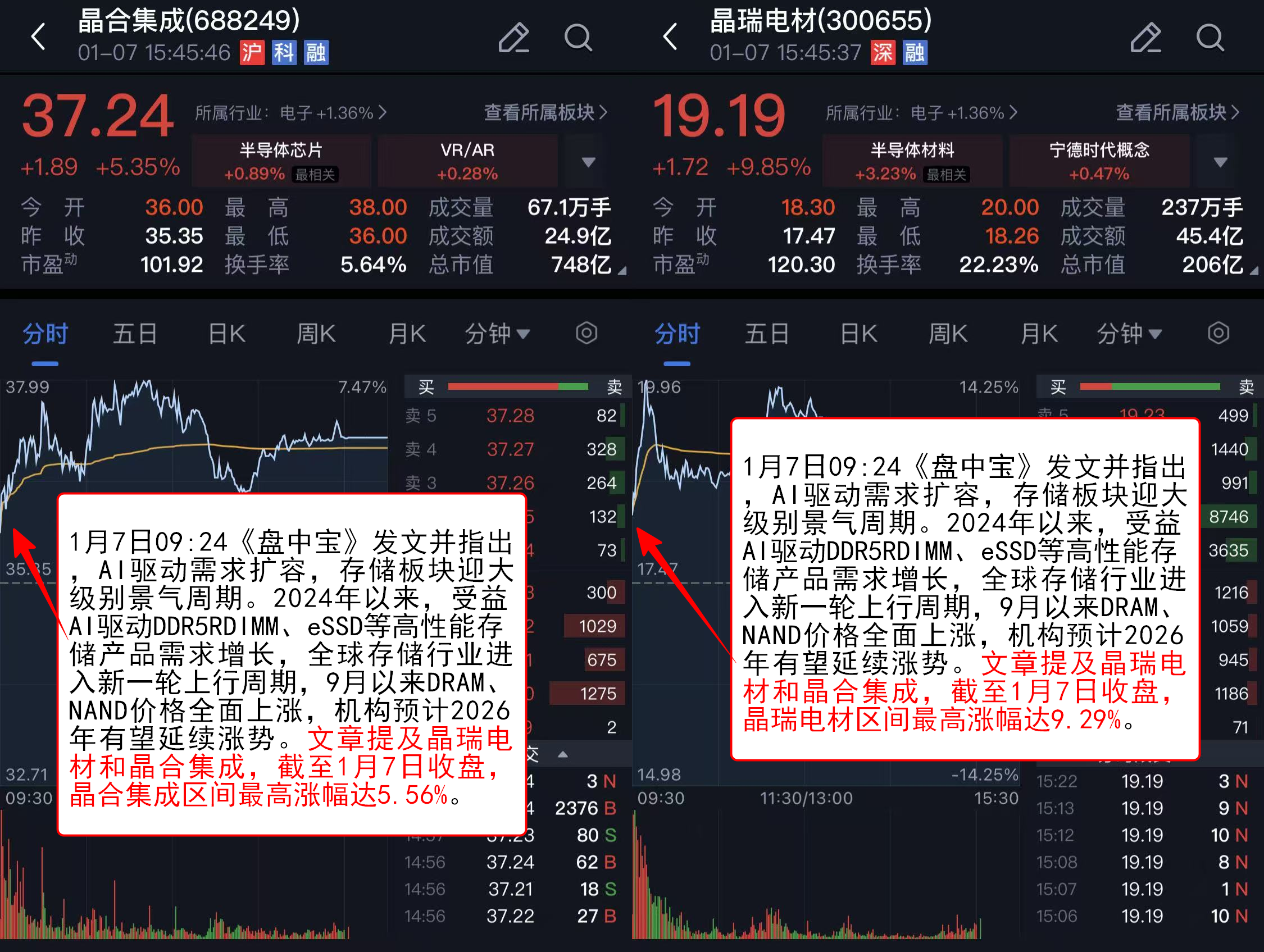 1月7日09:24《盘中宝》发文并指出,AI驱动需求扩容,存储板块迎大级别景气周期。2024年以来,受益AI驱动DDR5RDIMM、eSSD等高性能存储产品需求增长,全球存储行业进入新一轮上行周期,9月以来DRAM、NAND价格全面上涨,机构预计2026年有望延续涨势。文章提及晶瑞电材和晶合集成,截至1月7日收盘,晶瑞电材区间最高涨幅达9.29%,晶合集成区间最高涨幅达5.56%。