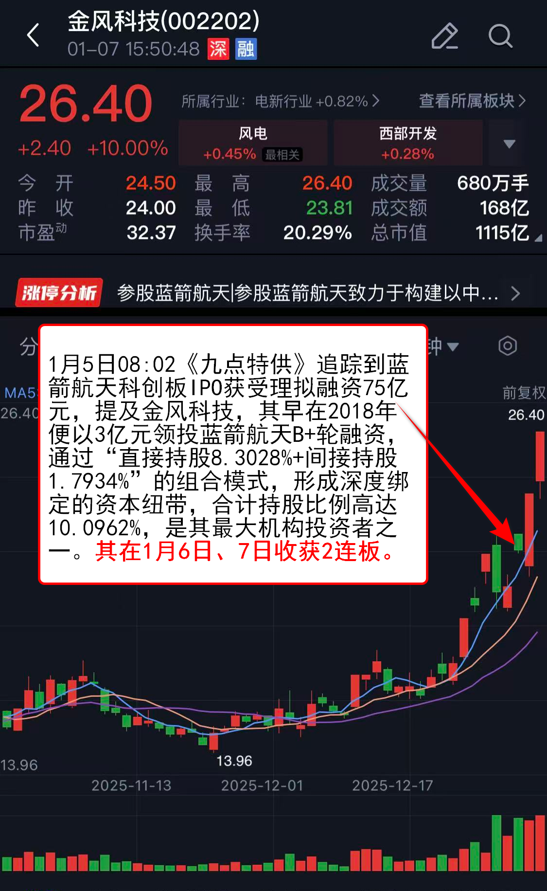 1月5日08:02《九点特供》追踪到蓝箭航天科创板IPO获受理拟融资75亿元,提及金风科技,其早在2018年便以3亿元领投蓝箭航天B+轮融资,通过“直接持股8.3028%+间接持股1.7934%”的组合模式,形成深度绑定的资本纽带,合计持股比例高达10.0962%,是其最大机构投资者之一。其在1月6日、7日收获2连板。