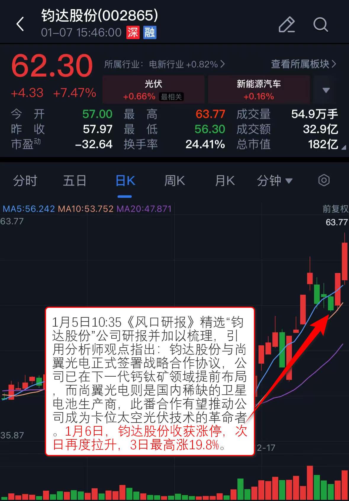 1月5日10:35《风口研报》精选“钧达股份”公司研报并加以梳理,引用分析师观点指出:钧达股份与尚翼光电正式签署战略合作协议,公司已在下一代钙钛矿领域提前布局,而尚翼光电则是国内稀缺的卫星电池生产商,此番合作有望推动公司成为卡位太空光伏技术的革命者。1月6日,钧达股份收获涨停,次日再度拉升,3日最高涨19.8%。