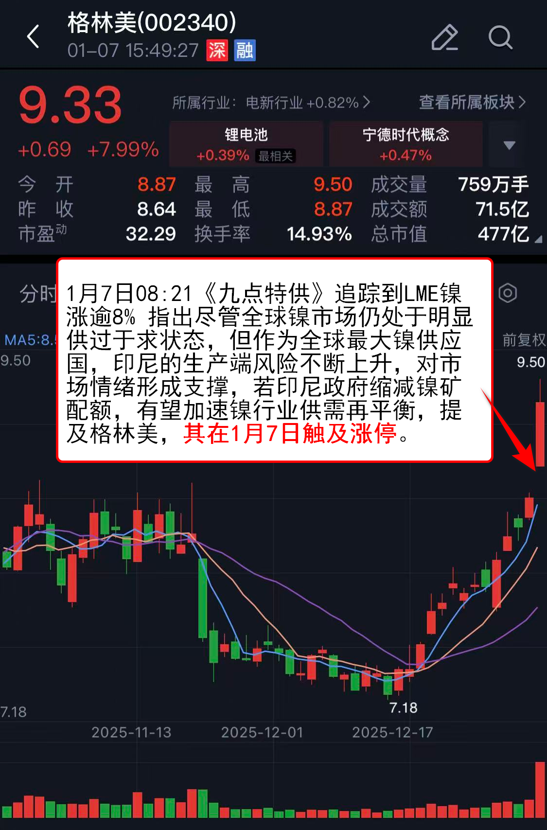 1月7日08:21《九点特供》追踪到LME镍涨逾8% 指出尽管全球镍市场仍处于明显供过于求状态,但作为全球最大镍供应国,印尼的生产端风险不断上升,对市场情绪形成支撑,若印尼政府缩减镍矿配额,有望加速镍行业供需再平衡,提及格林美,其在1月7日触及涨停。