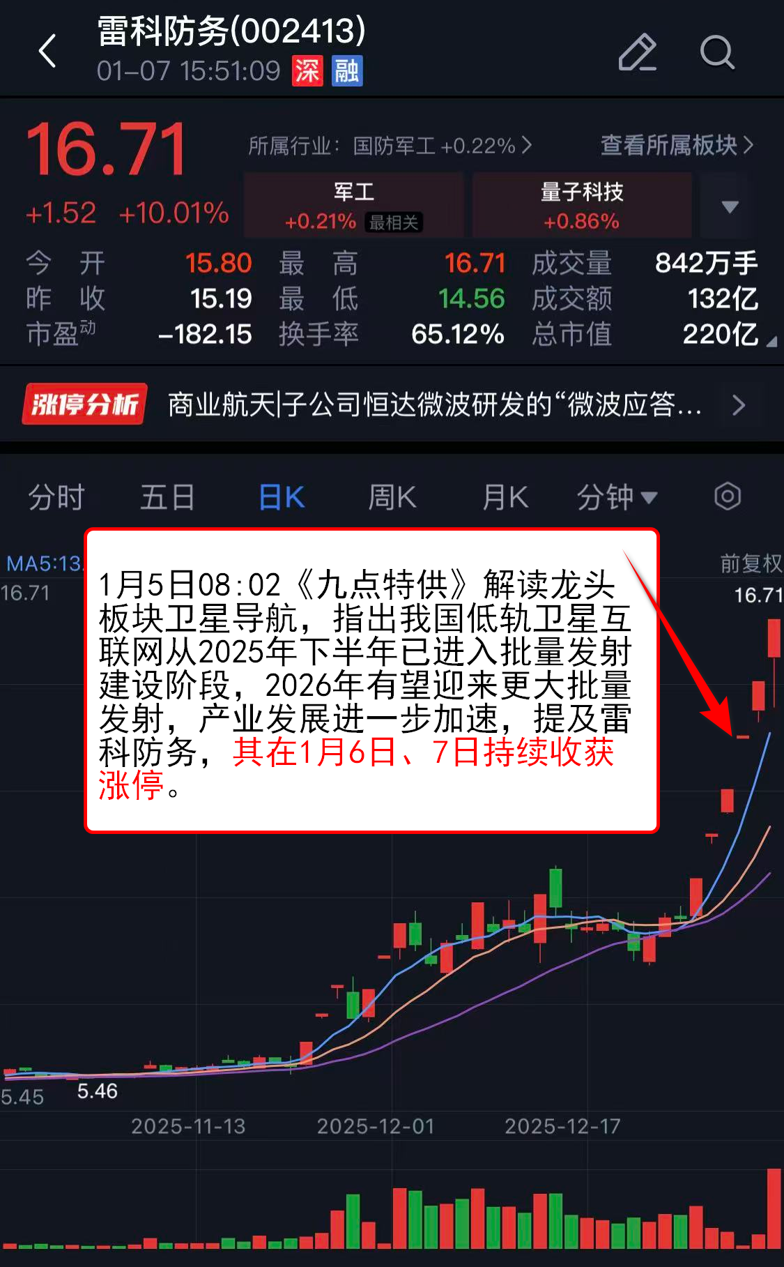 1月5日08:02《九点特供》解读龙头板块卫星导航,指出我国低轨卫星互联网从2025年下半年已进入批量发射建设阶段,2026年有望迎来更大批量发射,产业发展进一步加速,提及雷科防务,其在1月6日、7日持续收获涨停。