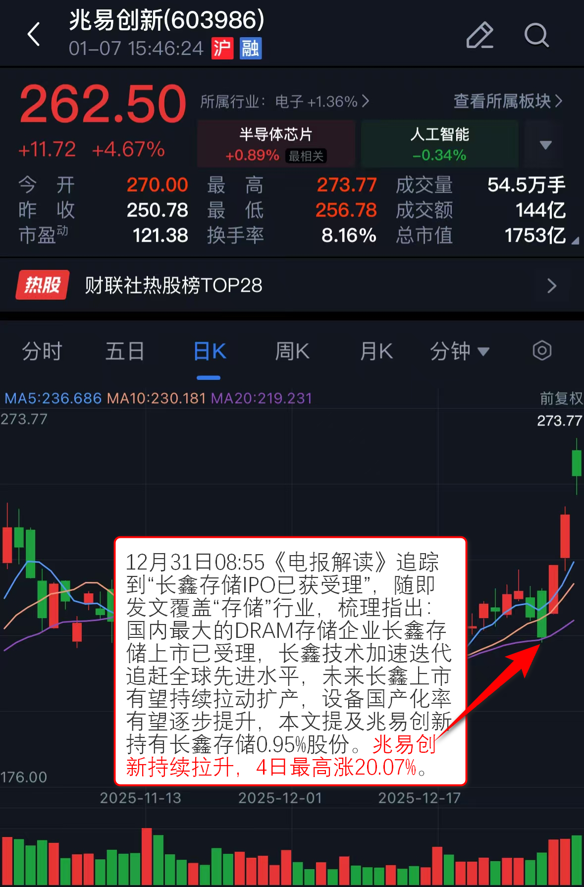 12月31日08:55《电报解读》追踪到“长鑫存储IPO已获受理”,随即发文覆盖“存储”行业,梳理指出:国内最大的DRAM存储企业长鑫存储上市已受理,长鑫技术加速迭代追赶全球先进水平,未来长鑫上市有望持续拉动扩产,设备国产化率有望逐步提升,本文提及兆易创新持有长鑫存储0.95%股份。兆易创新持续拉升,4日最高涨20.07%。