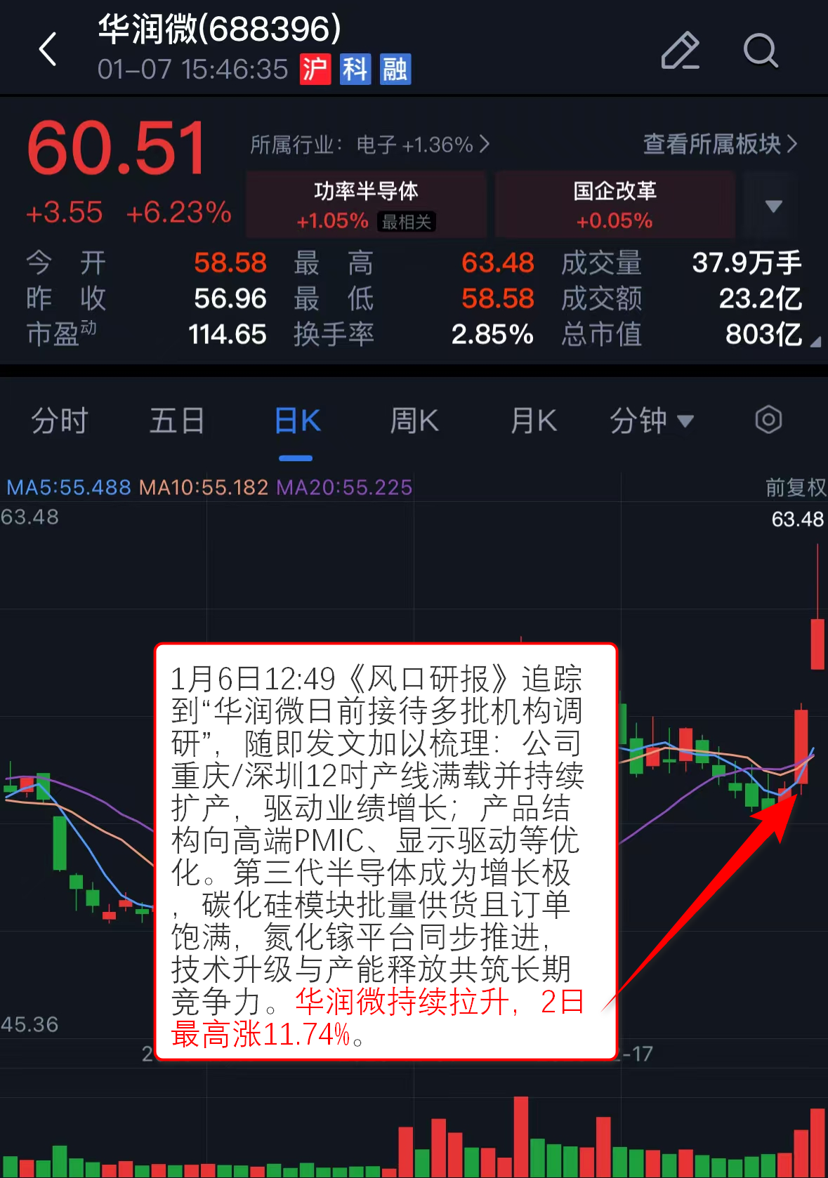 1月6日12:49《风口研报》追踪到“华润微日前接待多批机构调研”,随即发文加以梳理:公司重庆/深圳12吋产线满载并持续扩产,驱动业绩增长;产品结构向高端PMIC、显示驱动等优化。第三代半导体成为增长极,碳化硅模块批量供货且订单饱满,氮化镓平台同步推进,技术升级与产能释放共筑长期竞争力。华润微持续拉升,2日最高涨11.74%。