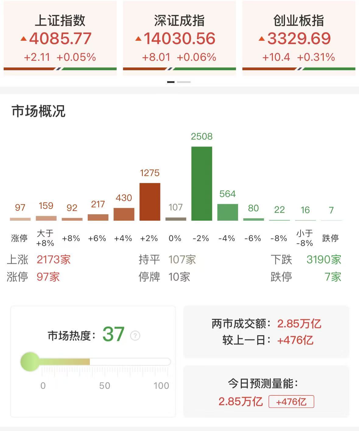 财联社1月7日讯,沪指微涨录得14连阳,创业板指冲高回落。沪深两市成交额2.85万亿,较上一个交易日放量476亿,成交额连续2个交易日超2.8万亿。盘面上,市场热点快速轮动,全市场超3100只个股下跌。从板块来看,商业航天概念反复活跃,十余只成分股涨停,雷科防务6连板,金风科技2连板。煤炭板块持续拉升,大有能源、陕西黑猫涨停。半导体设备股延续强势,中微公司、北方华创大涨续创历史新高。光刻胶概念表现活跃,国风新材3天2板,南大光电、彤程新材涨停。可控核聚变概念震荡走强,中国一重、中国核建涨停。下跌方面,脑机接口概念震荡回落,诚益通、爱朋医疗跌超10%。截至收盘,沪指涨0.05%,深成指涨0.06%,创业板指涨0.31%。