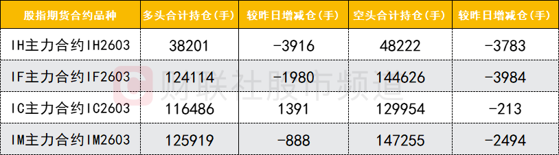 四大期指主力合约中,IH、IF、IM合约多空双方均减仓,IF(沪深300)合约空头减仓数量较多,空头减仓力度是多头的2倍,沪深300标的的空头压制有所缓解。而IC合约多头加仓,空头减仓。