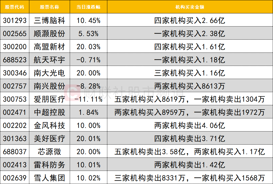 今日龙虎榜机构活跃度进一步提升,光刻胶概念股南大光电强势20cm涨停,获三家机构买入1.16亿,同时获深股通买入1.86亿。金风科技尾盘涨停走出2连板,遭两家机构大幅卖出4.06亿。脑机接口概念整体冲高回落,三博脑科四家机构买入2.66亿;爱朋医疗获五家机构买入8619万,同时遭一家机构卖出1304万;美好医疗遭四家机构卖出3.71亿。