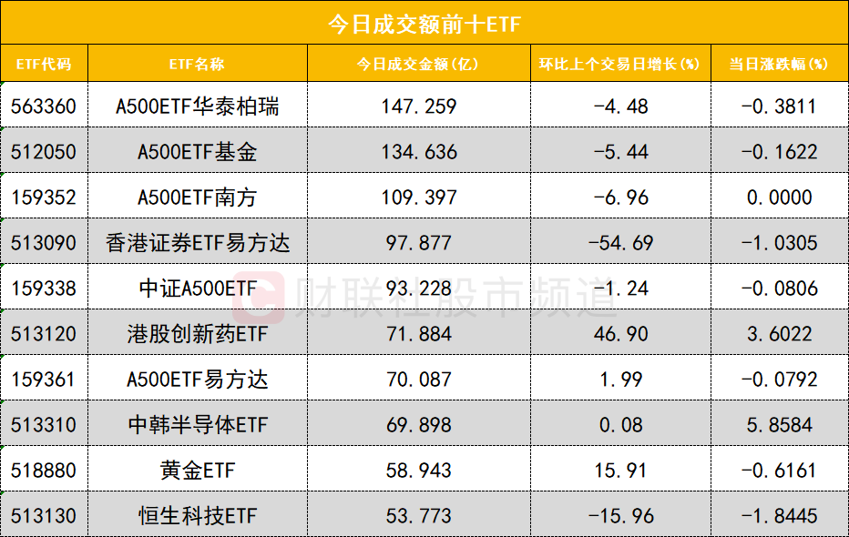 从成交额前十的ETF来看,A500ETF华泰柏瑞(563360)成交额位居首位,A500ETF基金(512050)成交额位居次席。