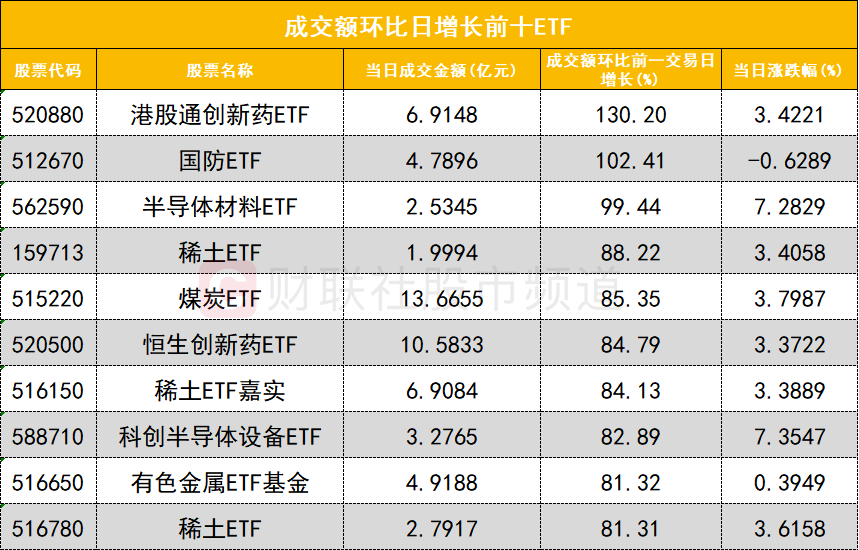 从成交额环比增长前十的ETF来看,港股通创新药ETF(520880)成交额环比增长130%位居首位;国防ETF(512670)成交额环比增长102%位居次席。