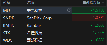 近期强势的存储概念股有所走弱,美光科技盘前跌1.5%,SanDisk、希捷科技跌超1%。受贵金属回落影响,矿业股盘前跌幅居前,纽曼矿业跌约3%,巴里克矿业跌超2%。