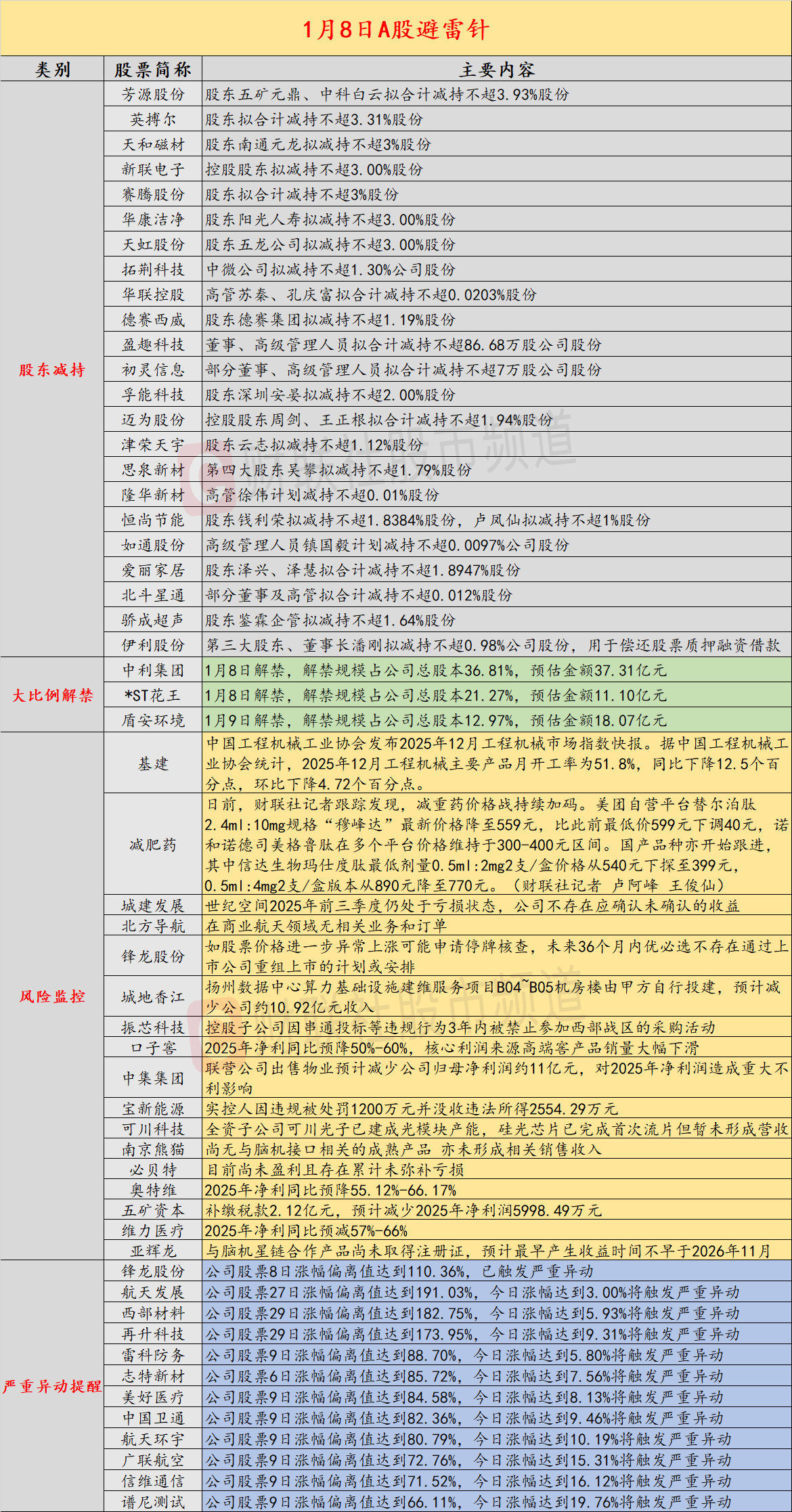 导读:财联社1月8日投资避雷针,近日,A股及海外市场潜在风险事件如下。国内经济信息方面包括:1)2025年12月工程机械主要产品月开工率为51.8%,同比下降12.5%,环比下降4.72%;2)GLP-1药物价格战愈演愈烈,国产品种玛仕度肽开始跟进降价;公司方面重点关注包括:1)4连板城建发展公告,世纪空间2025年前三季度仍处于亏损状态,公司不存在应确认未确认的收益;2)2连板北方导航表示,在商业航天领域无相关业务和订单;海外市场重点关注包括:1)美股三大指数收盘涨跌不一,纳斯达克中国金龙指数跌1.58%;2)特朗普指示美国退出“不符合该国利益”的66个国际组织。