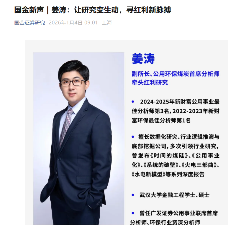 人才流动不断。国金证券通过官方微信公号宣布,90后新锐分析师姜涛正式官宣加盟国金证券,担任副所长、公用环保煤炭行业首席分析师、红利牵头人。姜涛曾任广发证券公用事业联席首席分析师、环保行业资深分析师,姜涛于2019年入行,2022年带队公用事业行业,目前已连续2年获得证券时报最佳分析师前3。他以生动和深度研究广受好评,曾发布《时间的煤硅》、《公用事业化》等具备影响力的专题报告。