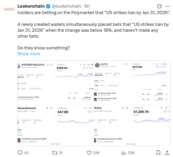更加巧合的是,还有四个新创建的账户在过去24小时内押注了“美国将在1月31日前袭击伊朗”,押注时该事件的赔率低于18%,且这四个新账户仅押注了这一单一事件。