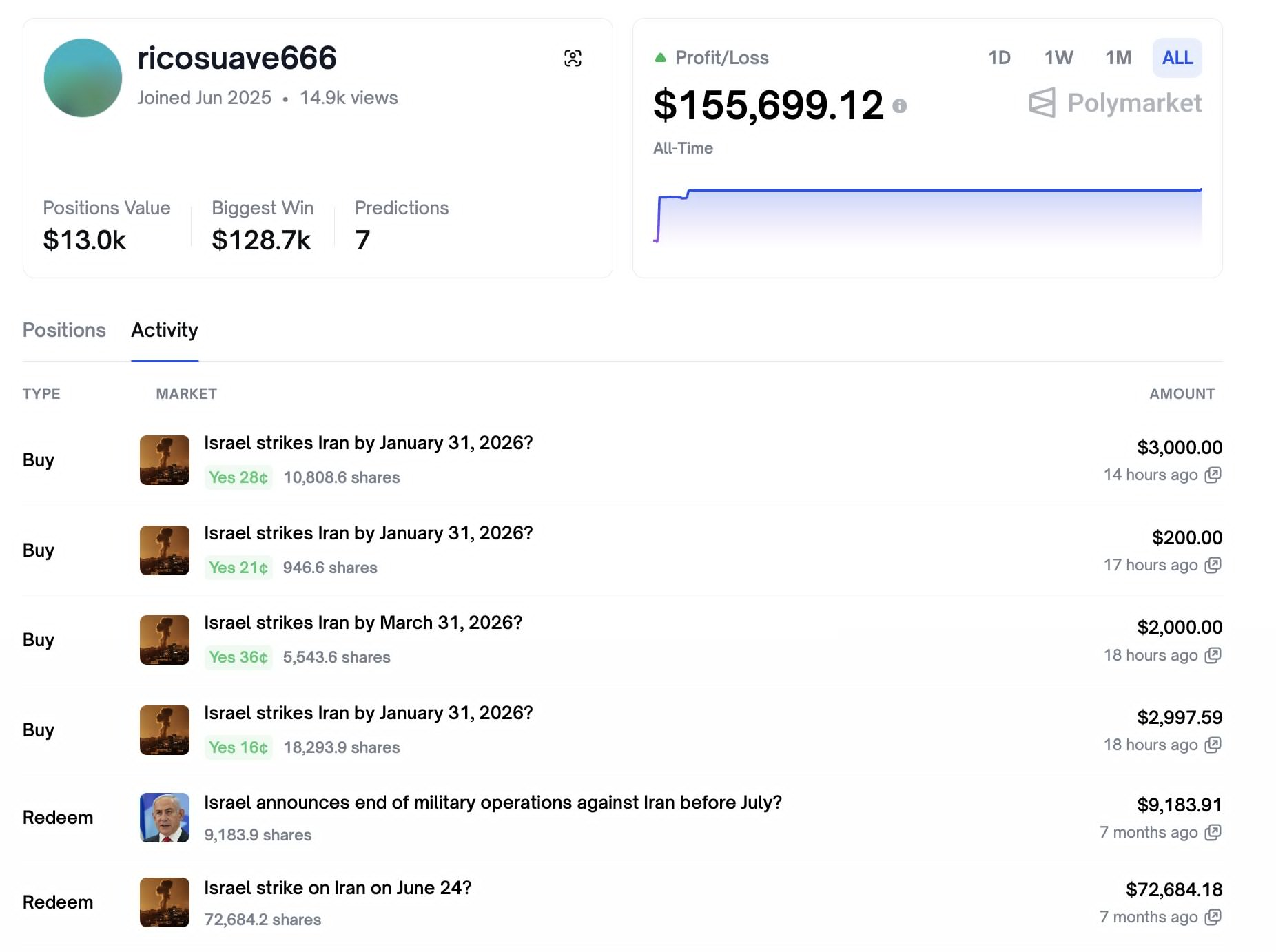 据区块链分析公司Lookonchain称,一名在Polymarket平台上沉寂了7个月的交易员已重返市场,押注“以色列将在1月31日前对伊朗发动袭击”。这名网名为ricosuave666的交易员共花费了8198美元押注上述事件,如果押注成功,其将获利近3.6万美元。