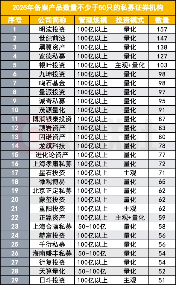 具体到机构名单,明汯投资以157只备案产品位居首位,世纪前沿备案147只,黑翼资产备案138只,宽德私募备案127只,银叶投资备案103只,九坤投资、鸣石基金分别备案98只,量派投资、诚奇私募、茂源量化、博润银泰投资、顽岩资产、因诺资产、龙旗科技、进化论资产等均在50只以上的队列之中。