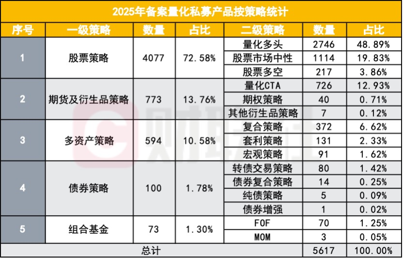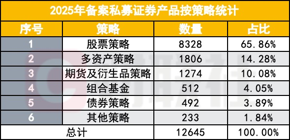 从总量维度看,12645只备案产品构成了2025年私募证券产品的基本盘。其中,股票策略产品达到8328只,占全部备案产品的65.86%,依然是私募机构最倚重的主战场。