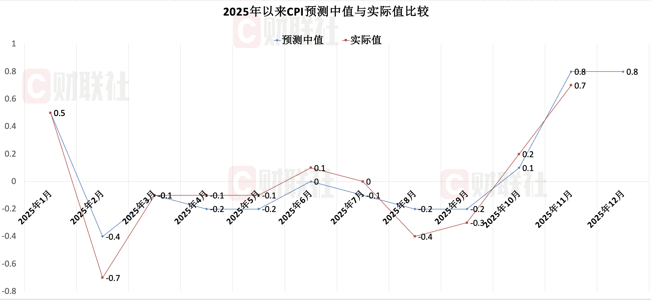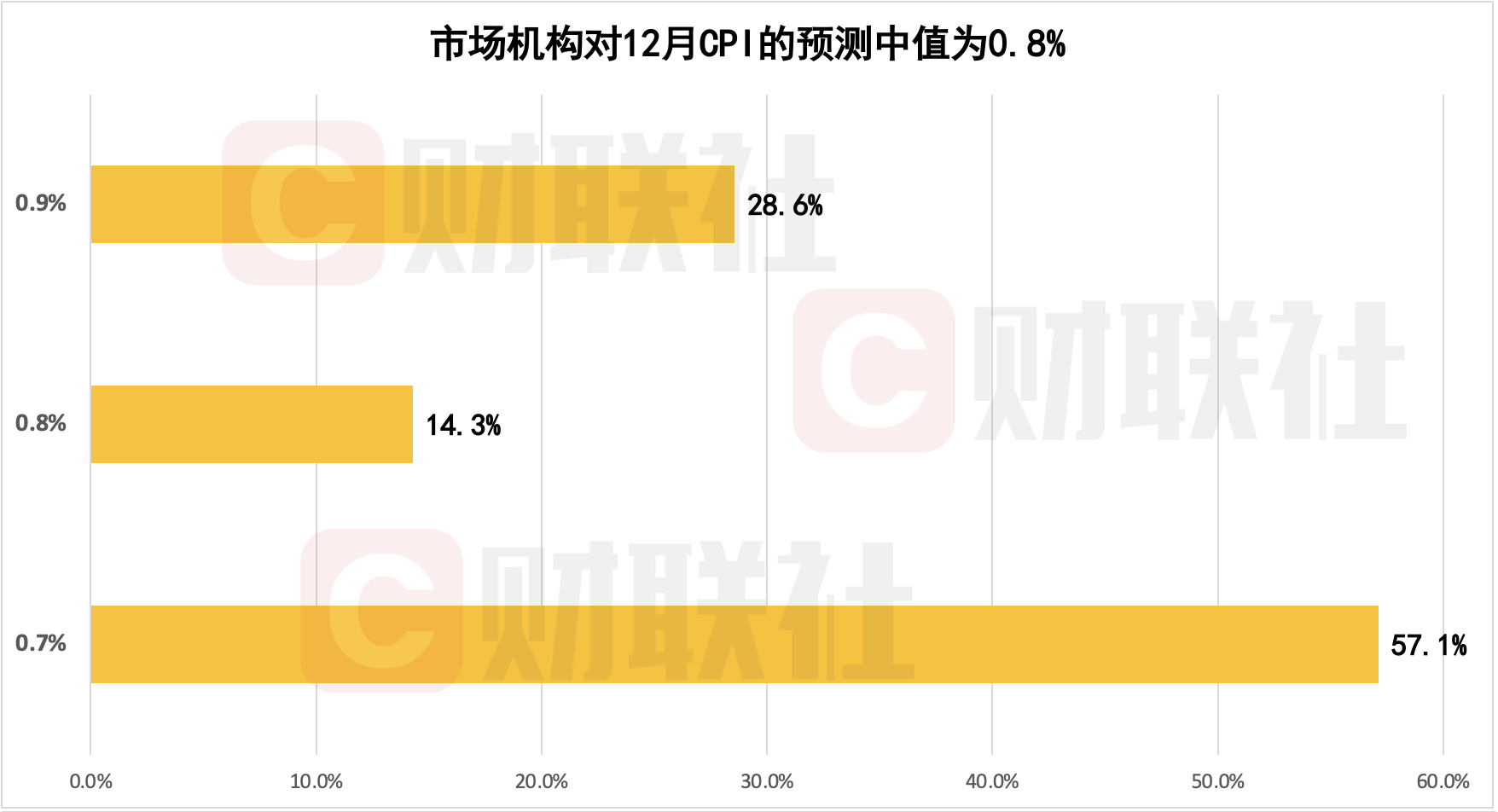 12月CPI同比表现与市场预期持平。财联社“C50风向指数”调查结果显示,市场机构对12月CPI的预测中值为0.8%,预测区间为0.7%至0.9%。