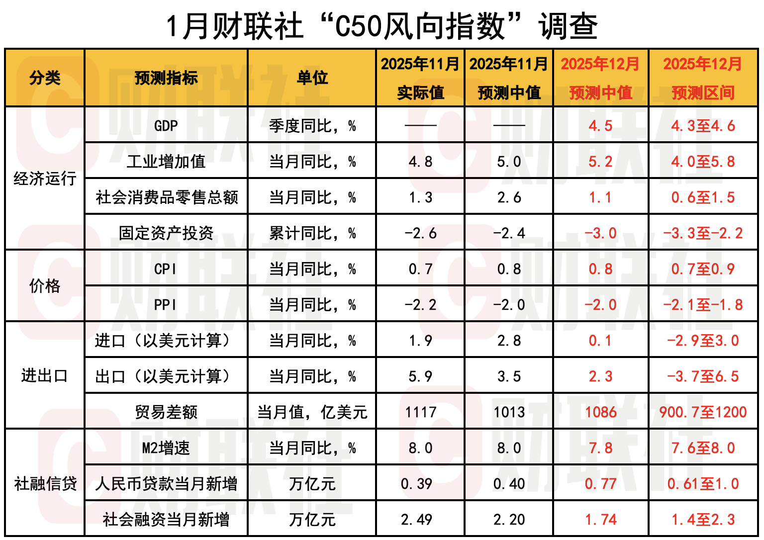 PPI方面,国家统计局数据显示,2025年12月PPI同比下降1.9%,降幅较11月收窄0.3个百分点,同比表现好于市场预期。财联社“C50风向指数”调查结果显示,市场机构对2025年12月PPI的预测中值为-2%,预测区间为-2.1%至-1.8%。