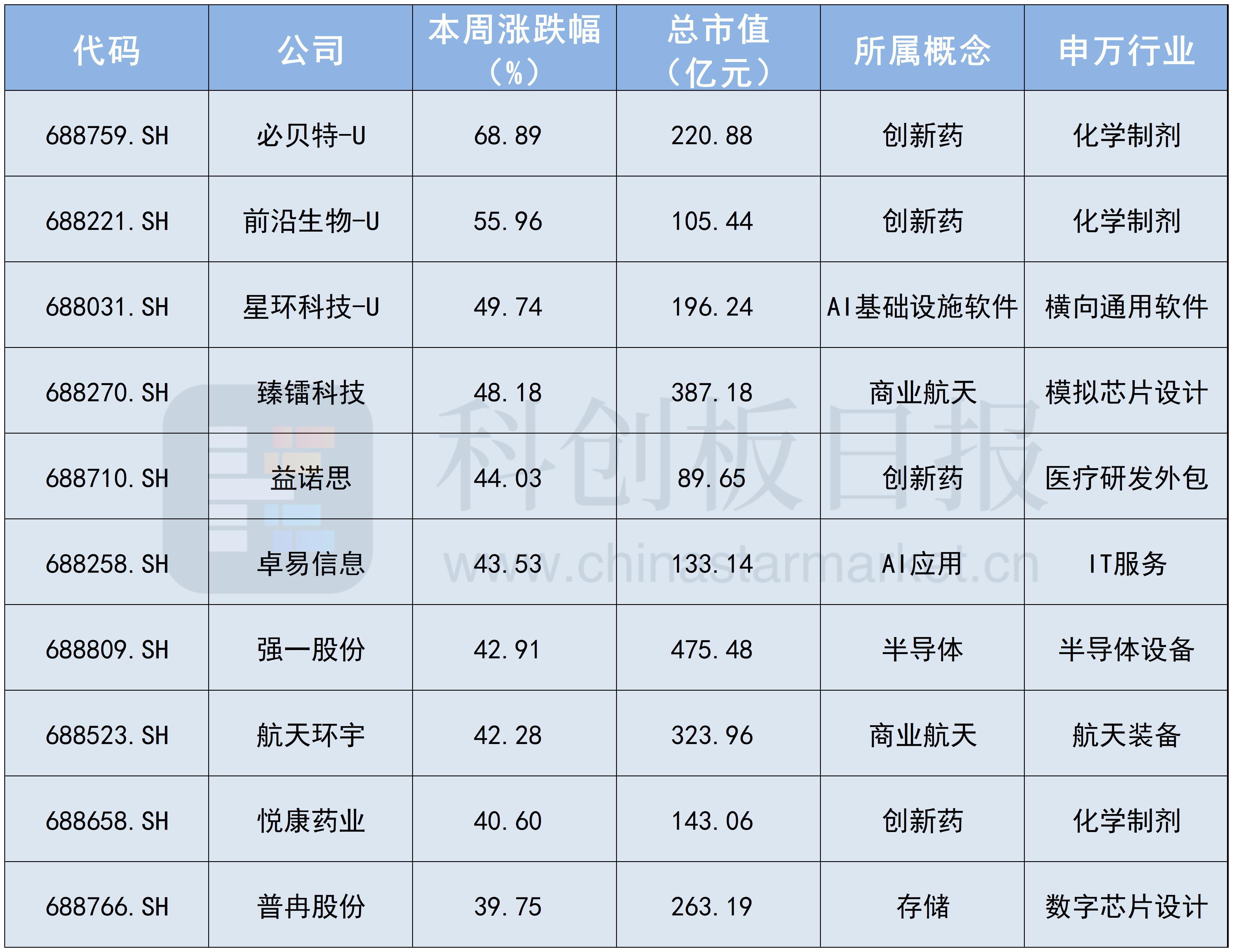 《科创板日报》1月10日讯 开年伊始,A股科技热点此起彼伏,科创板综指更是一周上涨超10%。《科创板日报》统计了本周科创板涨幅排名前十的个股,并罗列出个股所属概念及行业。根据计算,本周科创板十大牛股的平均涨幅约为47.59%。
