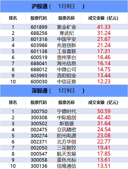 从沪股通前十大成交个股来看,紫金矿业位居首位;寒武纪和中国平安分居二、三位。