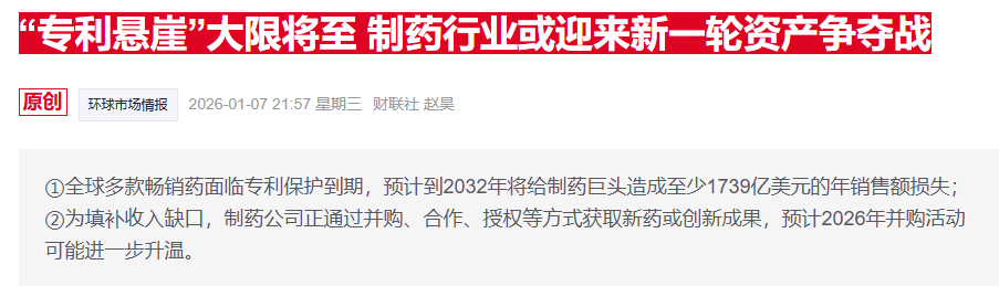 随着多款重磅药物即将面临专利到期,大型药企近几个月掀起新一轮生物科技并购潮。数据显示,去年医药并购总规模已达到1350亿美元,较2024年水平高出了一倍之多。