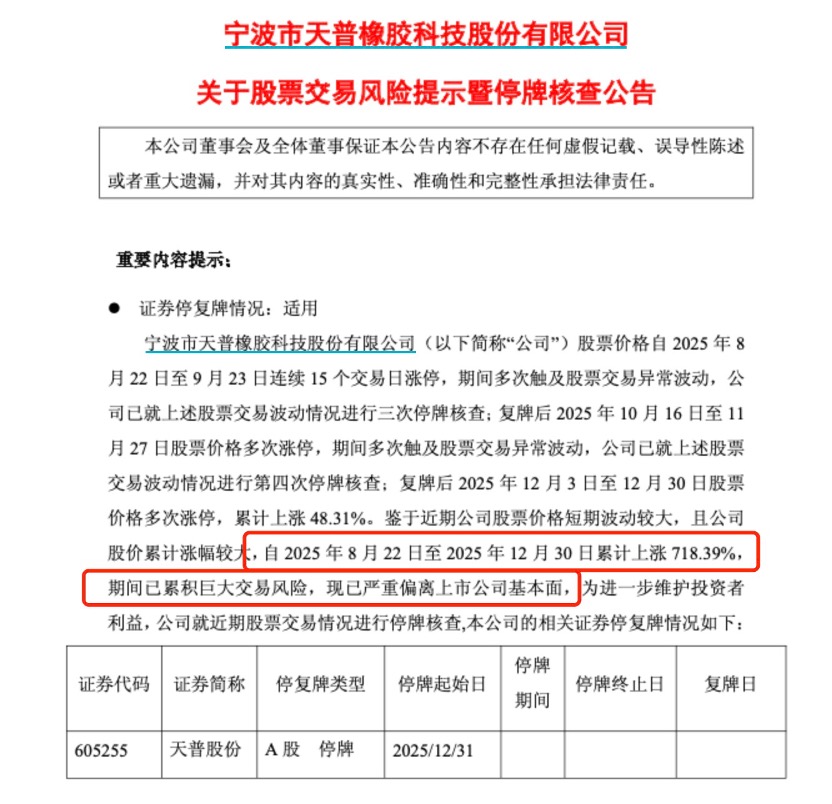但是2025年12月31日,子公司天普欣才将经营范围变更为橡胶制品制造、汽车零部件及配件制造等。同日,天普股份发布了关于股票交易风险提示暨停牌核查的公告,回应了三大市场传言。