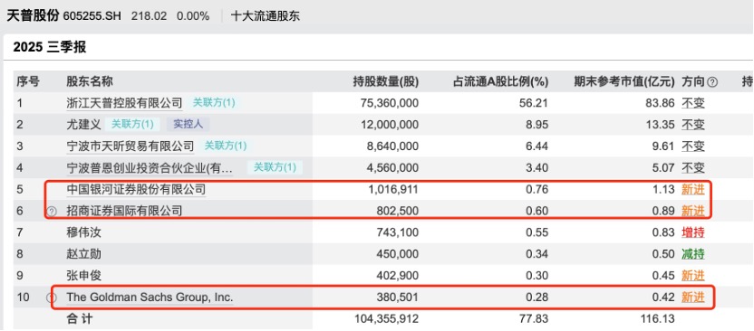 截至2025年三季度末,新晋前十大流通股的机构投资者分别是中国银河(持股占比0.76%)、招商证券国际(持股占比0.6%)以及高盛集团(持股占比0.28%)。