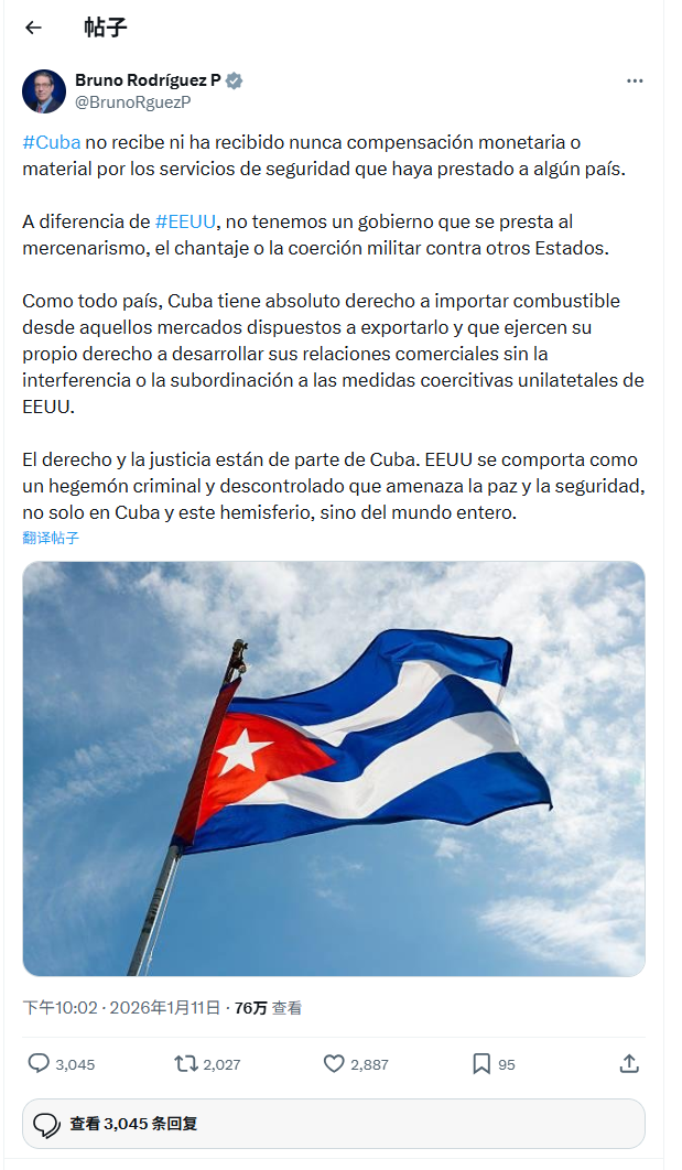 此外,针对美国的威胁性言论,古巴外长罗德里格斯11日也在社交媒体上发文回应说,古巴从未因任何“安全服务”而获得经济补偿,并辩称古巴有权与任何它喜欢的国家进行商业往来。