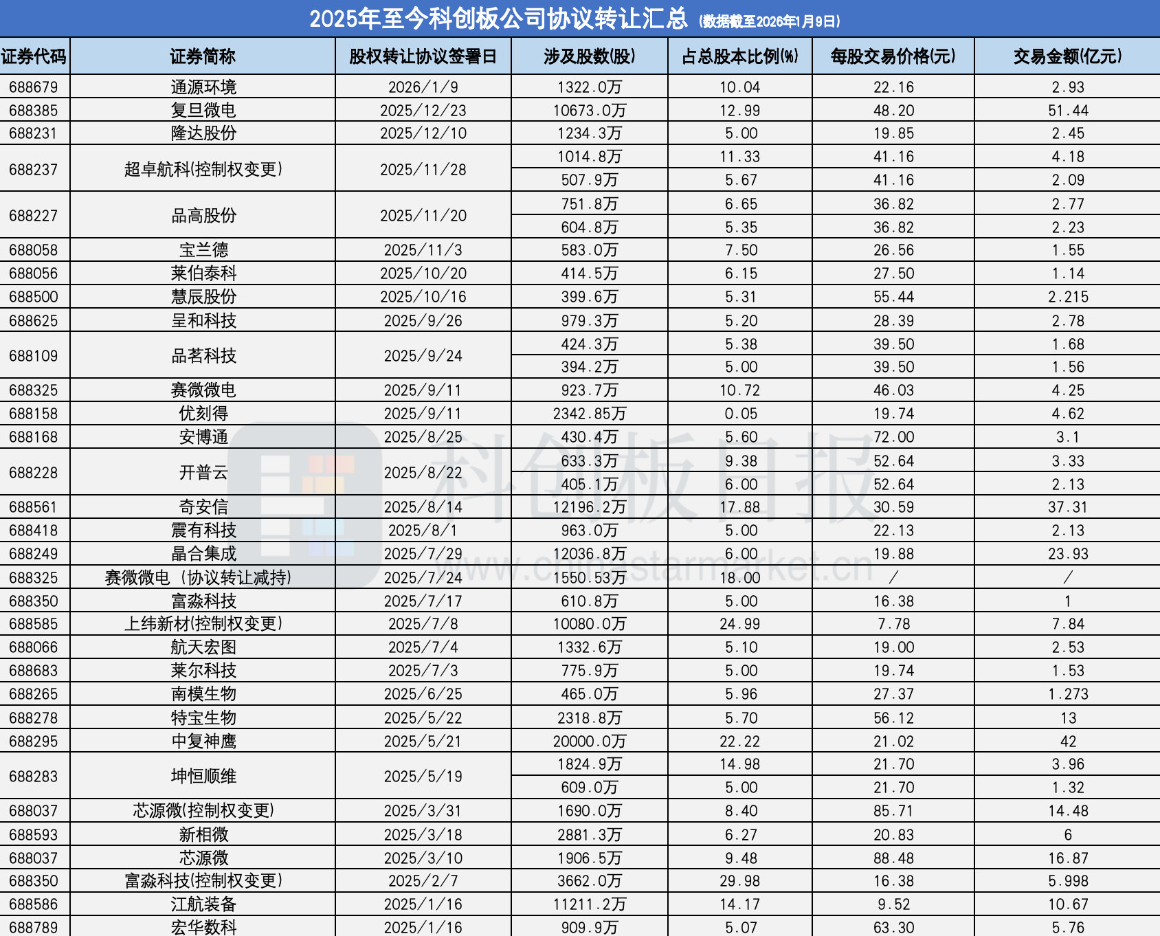 2025年至今约超30家科创板公司股东进行协议转让 上纬新材、芯源微等企业控制权已变更